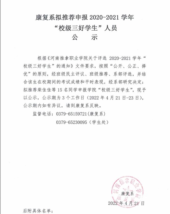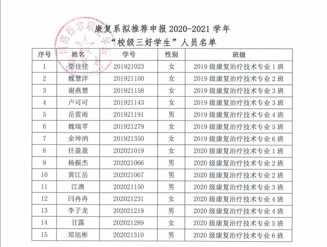 康复系2020-2021学年“校级三好学生”拟推荐人选公示