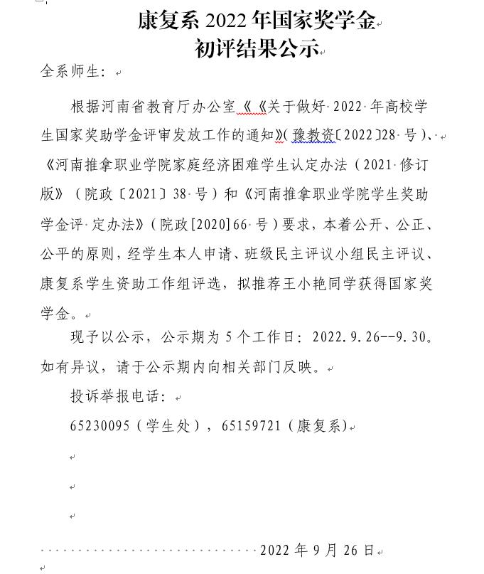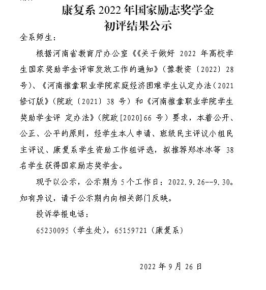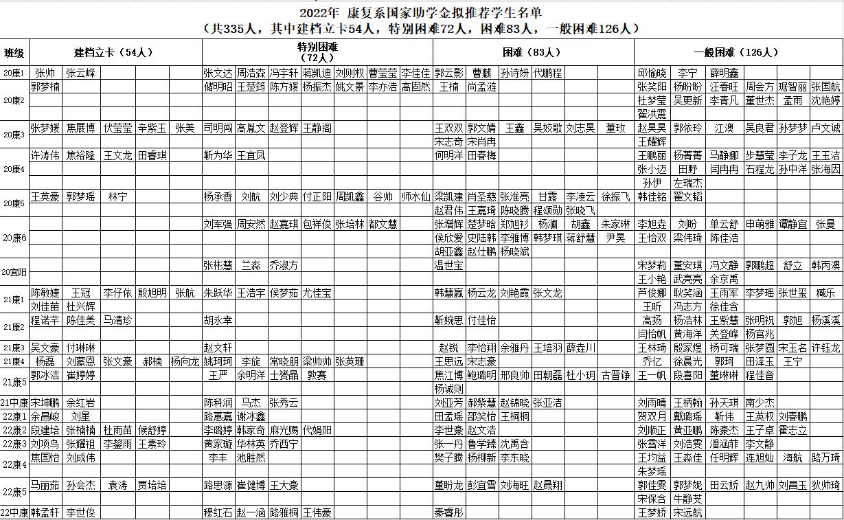 康复系2022年奖助学金评定结果公示