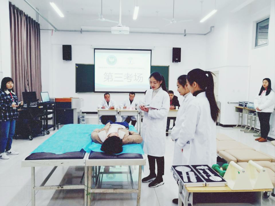 此次技能大赛的办赛理念为“夯实基础、提升技能、选拔人才”。大赛采用两轮赛制,第一阶段为“笔试考试”环节,主要考察学生对于专业基础课和专业课知识的掌握程度。第二轮为技能竞赛单元,技能竞赛主要考察学生运用知识和团队协作能力。技能竞赛要求学生三人一组分别负责“问诊”、“评定”和“治疗”环节,模拟临床诊疗过程。