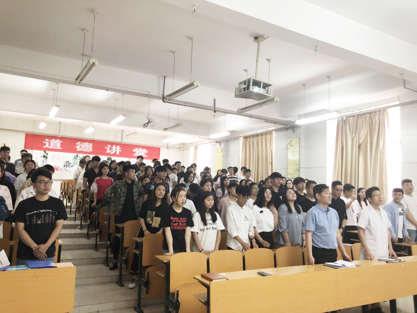 此次“道德讲堂”活动以“以德立身,勤学奉献”为核心,向师生宣讲职业道德知识。活动分6个环节进行,按照“道德讲堂”活动实施的要求开展,分别为唱经典歌曲、诵读道德经典、讲先锋模范事迹、畅谈感悟体会、学习医德规范、向“德”字鞠躬。