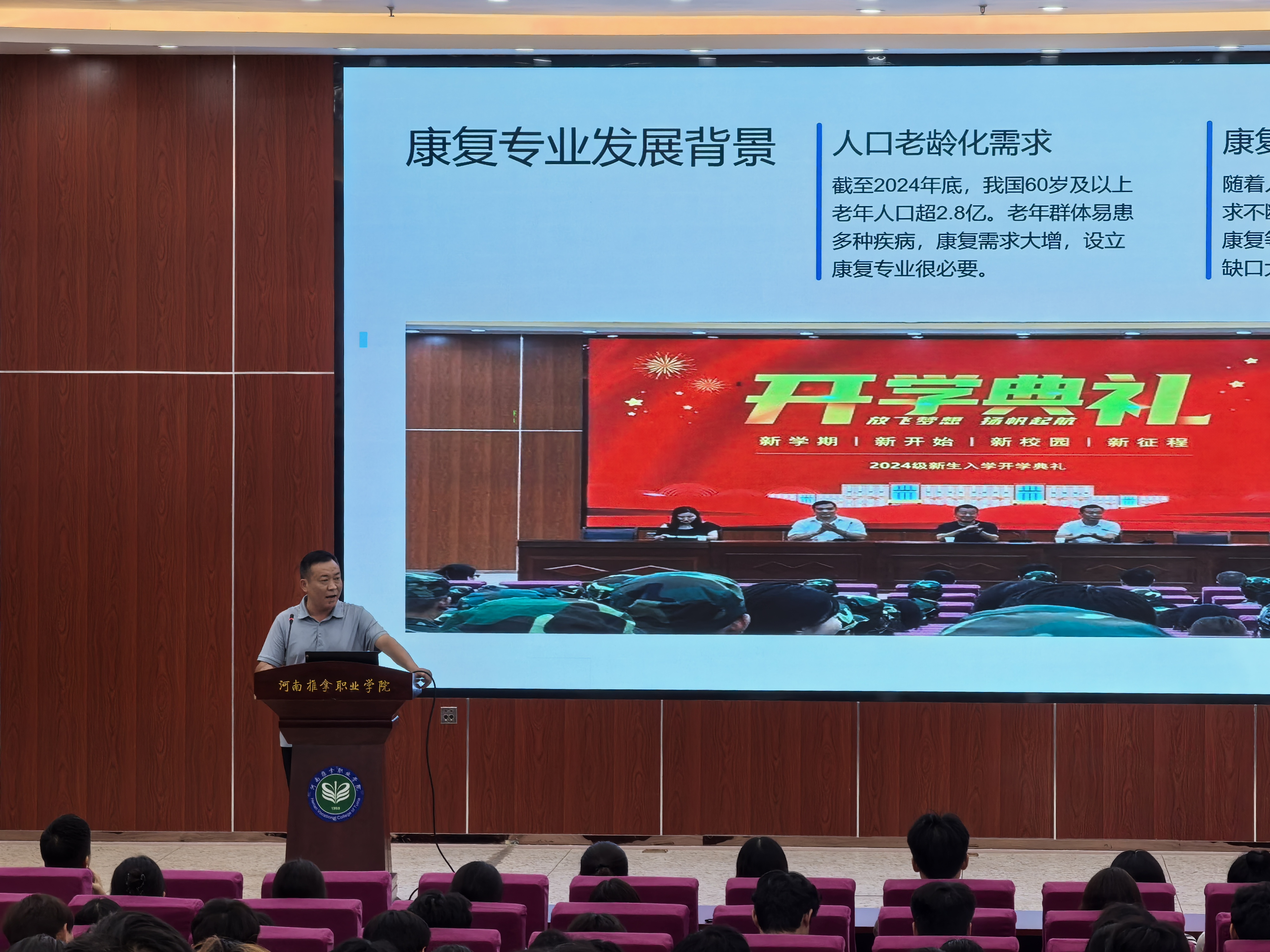 康复系副主任李得荣同志系统阐述了康复专业的内涵与发展,分别从历史传承(学科底蕴与发展历程)、当下现状(师资、教学资源、实训条件)和未来展望(行业趋势、社会需求、就业前景)三个维度为新生描绘了清晰的学科图景,并寄语新生注重理论基础与实践能力双提升。要求新生扎实学习知识,并在实践中转化应用,服务患者,树立正确职业价值观。