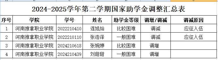 为扎实做好2024-2025学年春季学期的学生资助工作,保证我系2024-2025学年春季学期国家助学金正常发放,根据教育部《普通本科高校、高等职业学校国家助学金管理暂行办法》和《河南推拿职业学院学生奖助学金评定办法》,以及学院《关于2024-2025学年春季学期国家助学金资格复核的通知》要求,本着公开、公正、公平的原则,最终调减连旭灿、张浩泽两人,调增张婉婷、刘甜甜两人。