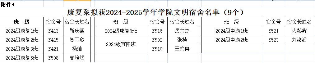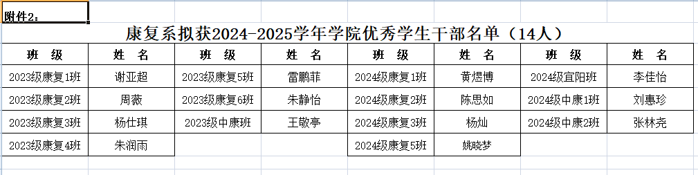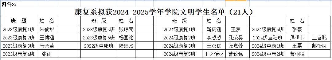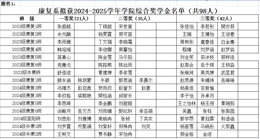 根据《河南省学生资助中心关于做好2025年高校国家奖助学金评审发放工作的通知》、《河南推拿职业学院家庭经济困难学生认定办法(2021 修订版》(院政〔2021〕38 号)和《河南推拿职业学院学生奖助学金评定办法》(院政[2020]66 号)要求,本着公开、公正、公平的原则,经学生本人申请、班级民主评议小组民主评议、康复系学生资助工作组评选,拟推荐张超越等98名学生获得学业奖,谢亚超等14名学生获得优秀学生干部奖,朱俊华等21名学生获得文明学生奖,2024级康复医教协同宜阳班获得文明班级奖,E413等9个宿舍获得文明宿舍奖。